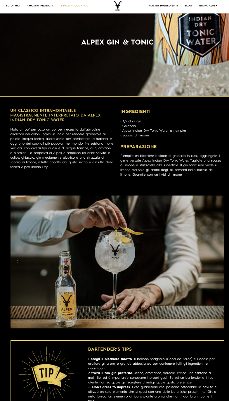 Per ogni Alpex vi sono inoltre alcuni suggerimenti di cocktail, i classici intramontabili e altre interpretazioni ideate per valorizzarne ulteriormente le peculiarità. La sezione “Cocktails”, infatti, non si rivolge solo ai barman più estrosi ma anche a chi vuole offrire un aperitivo o un after dinner semplice ma di sicuro effetto, utilizzando un prodotto esclusivo e ricercato.