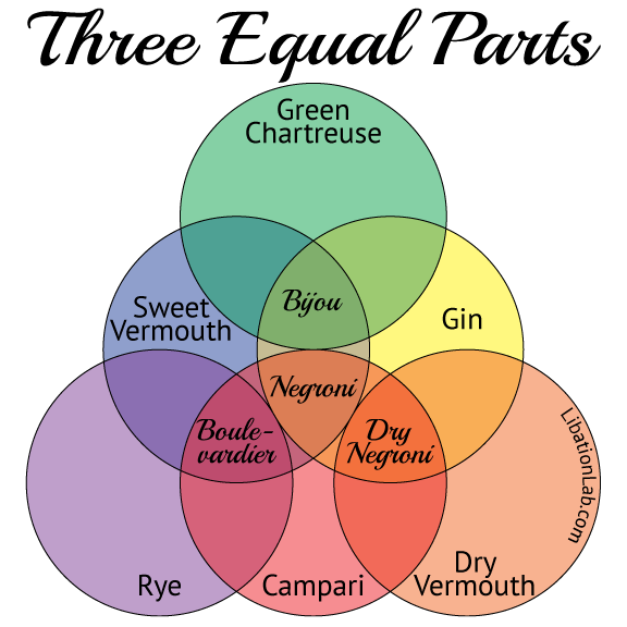 It doesn’t get much easier than this: equal measures of three ingredients to make these four fantastic cocktails from only six bottles – and now I have an excuse to make a Venn Diagram.